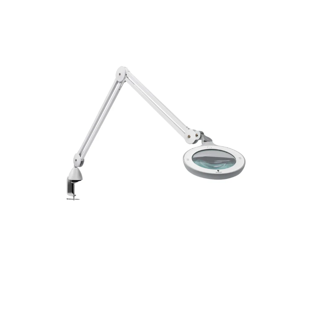 Cette lampe de conception ergonomique contemporaine est équipée d’une lentille en verre blanc de qualité optique de 12,7 cm de diamètre et offre un grossissement de 3 dioptries (1,75x). Elle inclut 42 LED Daylight ultra-lumineuses et 2 niveaux de luminosité pour un éclairage précis de tous les détails. Le joint de tête multipositions permet de positionner facilement la lampe d’une seule main. Le bras longue portée avec ressorts internes garantit des mouvements sans effort et un positionnement précis. Elle est idéale pour tous les environnements électroniques, industriels et d’inspection.