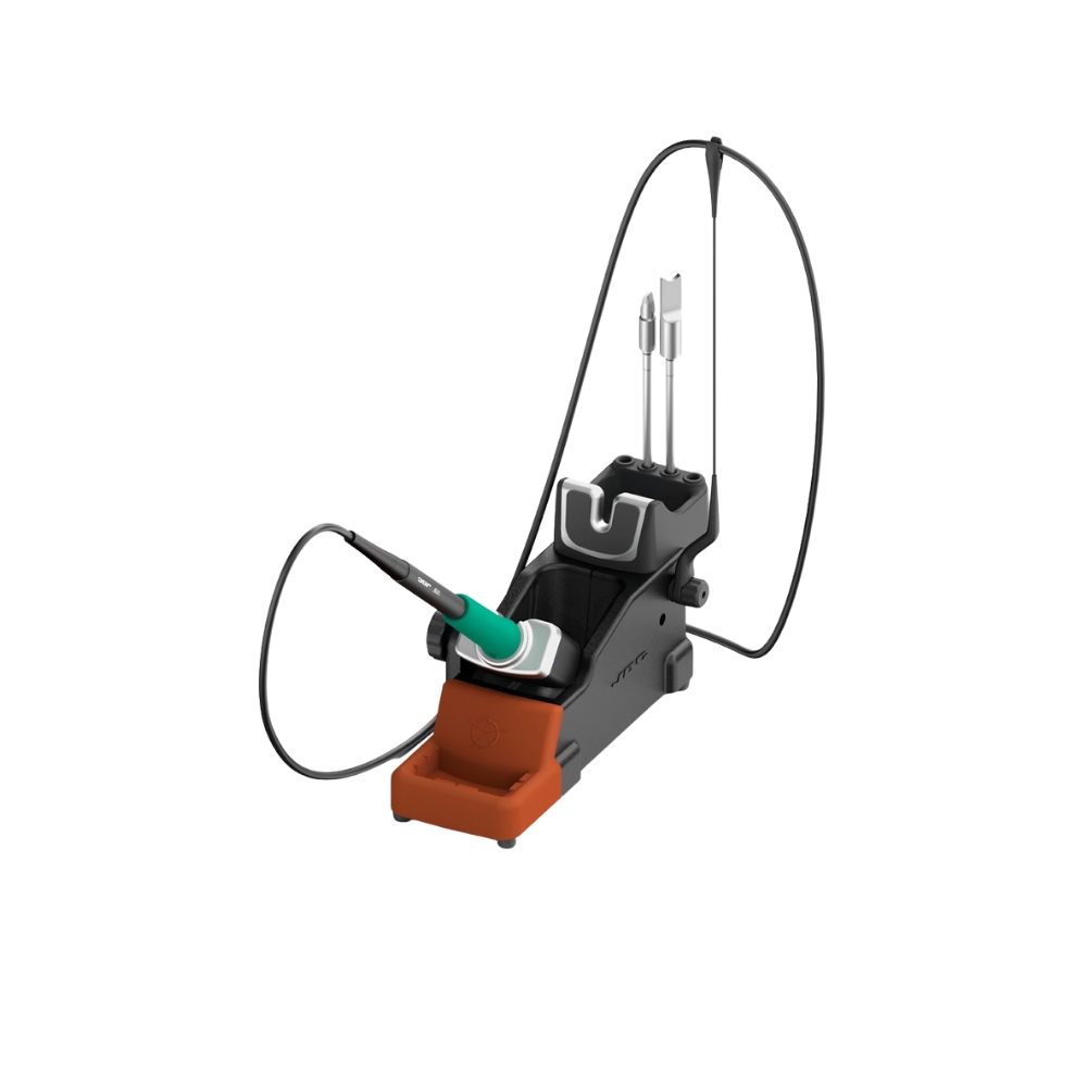 Le JBC Intelligent Heat Management du support de fer HDS détecte automatiquement l’outil dans le support et réduit la température de la panne en dessous du point de fusion de la soudure. Le mode hibernation coupe l’alimentation, empêchant ainsi l’oxydation. En conséquence, la durée de vie de la panne est multipliée par cinq. Le support comprend un nettoyeur de panne avec laine de laiton, ainsi qu’un pare-éclaboussures et une membrane anti-éclaboussures pour garder la zone de travail propre et exempte de particules de soudure. Le système d’échange rapide de pannes permet un échange sûr, facile et rapide, qui, combiné avec le support, permet de stocker jusqu’à quatre pannes.